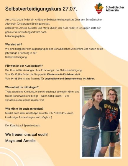 Das war etwas Besonders in der Ortsgruppe Einsingen! Am 27.07.2025 gab es erstmalig einen Selbstverteidigungskurs, der SUPER bei den Teilnehmenden angekommen ist! Der Kurs erstreckte sich über vier Stunden und richtete sich in erster Linie an Personen ab acht Jahren ohne jegliche Erfahrung in der Selbstverteidigung. Geleitet wurde er von zwei Mitgliedern der Jugendgruppe des Schwäbischen Albvereins, Maya und Amelie. Im Verlauf des Nachmittags erlernten die zehn Teilnehmenden nicht nur praktische Fähigkeiten und den Umgang mit bedrohlichen Situationen, sondern auch Verhaltensweisen, um solche Situationen schon im Voraus zu vermeiden.