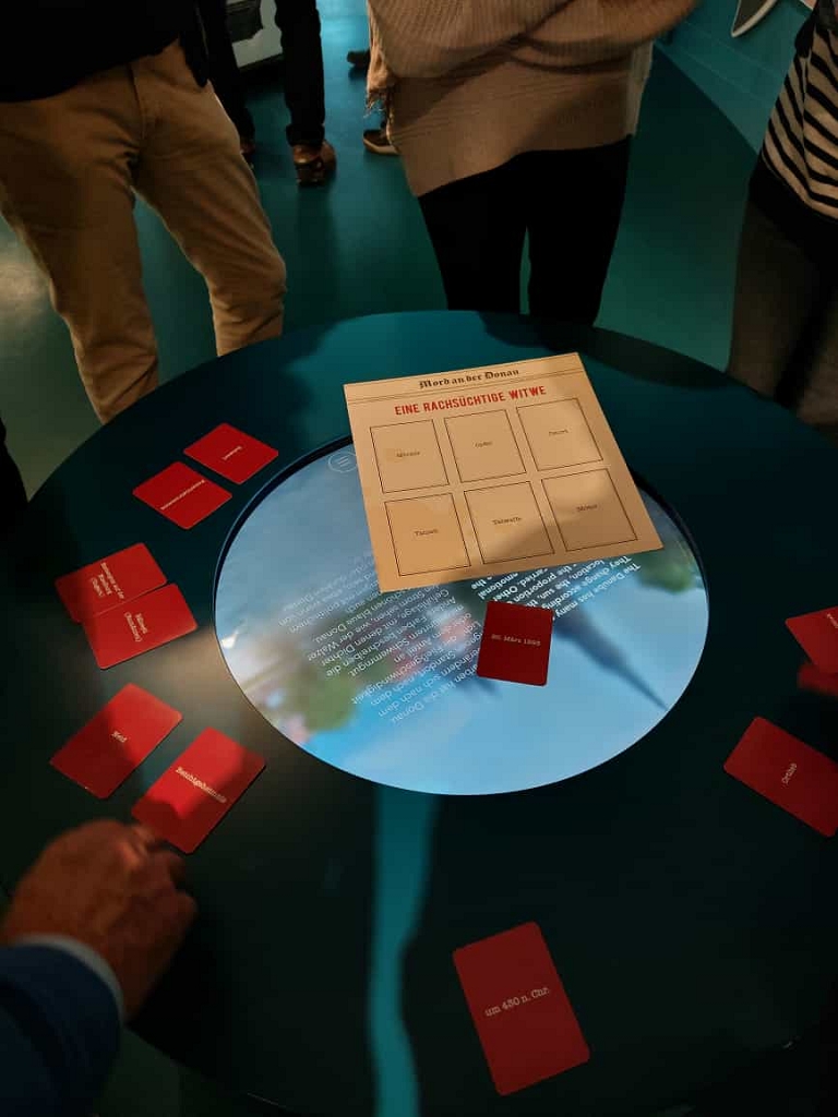 Es wurden uns kurze Informationen zum Mordfall vorgelesen und wir hatten dann, anhand von Info-Rollups und verschiedenen Hinweiskarten Opfer, Mörder, Tatmotiv, Datum, Tatwerkzeug und den Tatort zu bestimmen. Gemeinsam wurde gerätselt und kombiniert und nach ca. 1,5 kurzweiligen Stunden waren (fast) alle Mordfälle aufgeklärt.