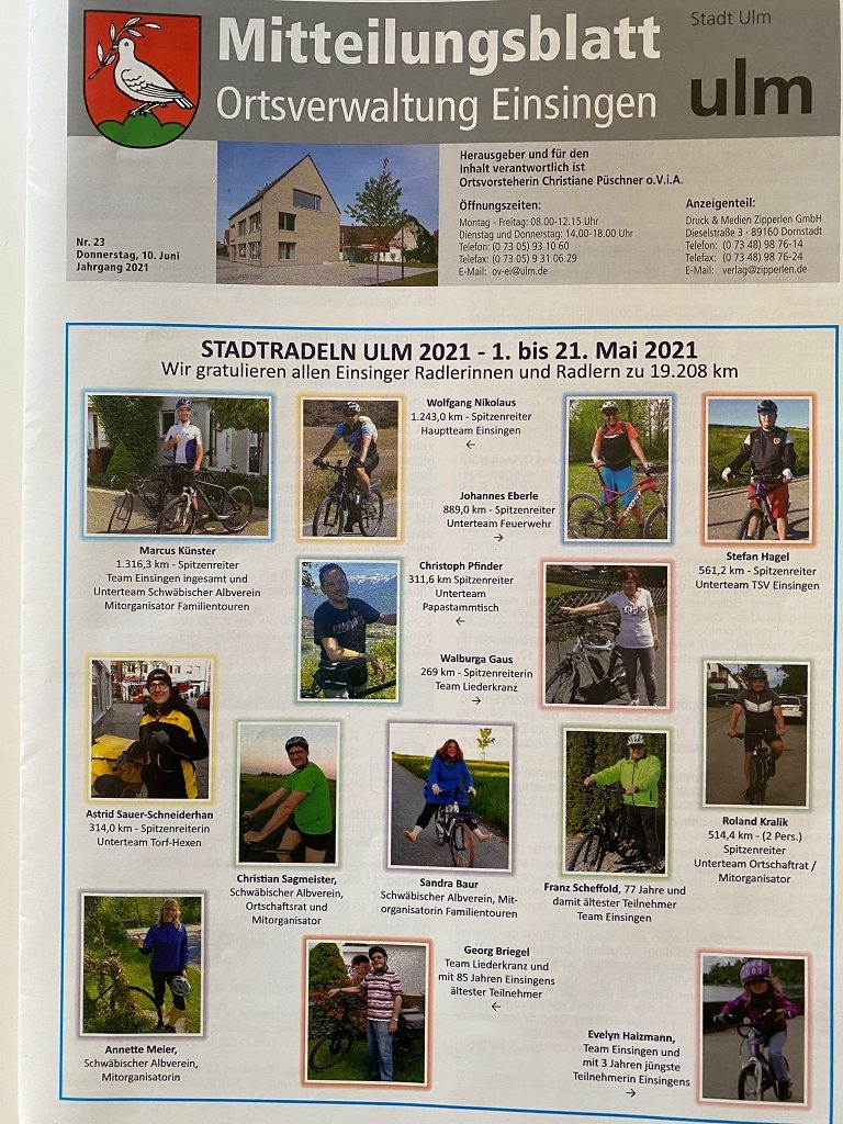 Herzlichen Glückwunsch an alle Radfahrende und vielen Dank fürs Mitradeln. Mehr als 100 Aktive haben Ihren inneren Schweinehund überwunden und sind fürs „TEAM EINSINGEN“ in den ersten 3 Maiwochen bei teilweise sehr grenzwertigem Wetter unermüdlich in die Pedale getreten und haben somit zum tollen Teamergebnis beigetragen. VIELEN DANK!