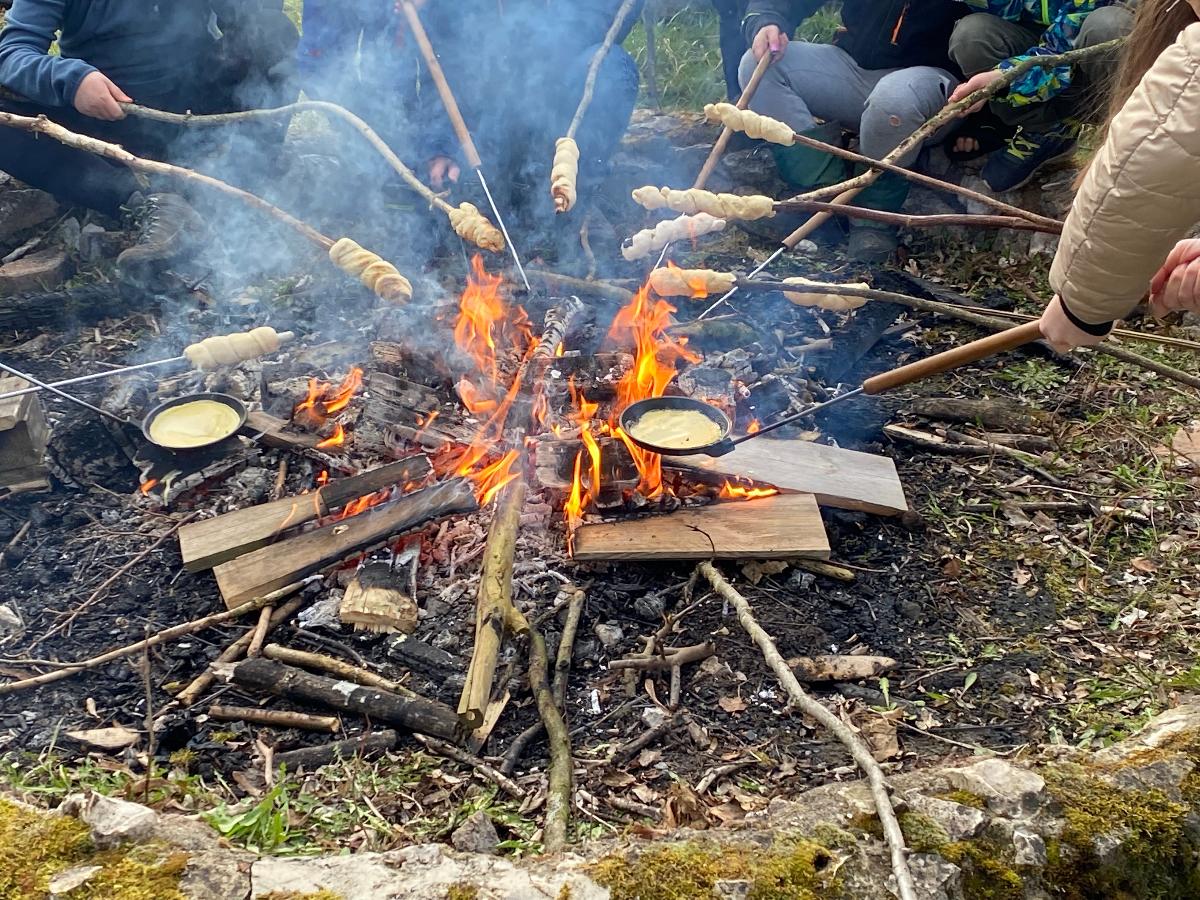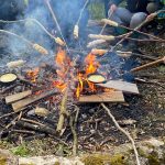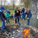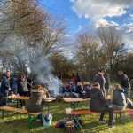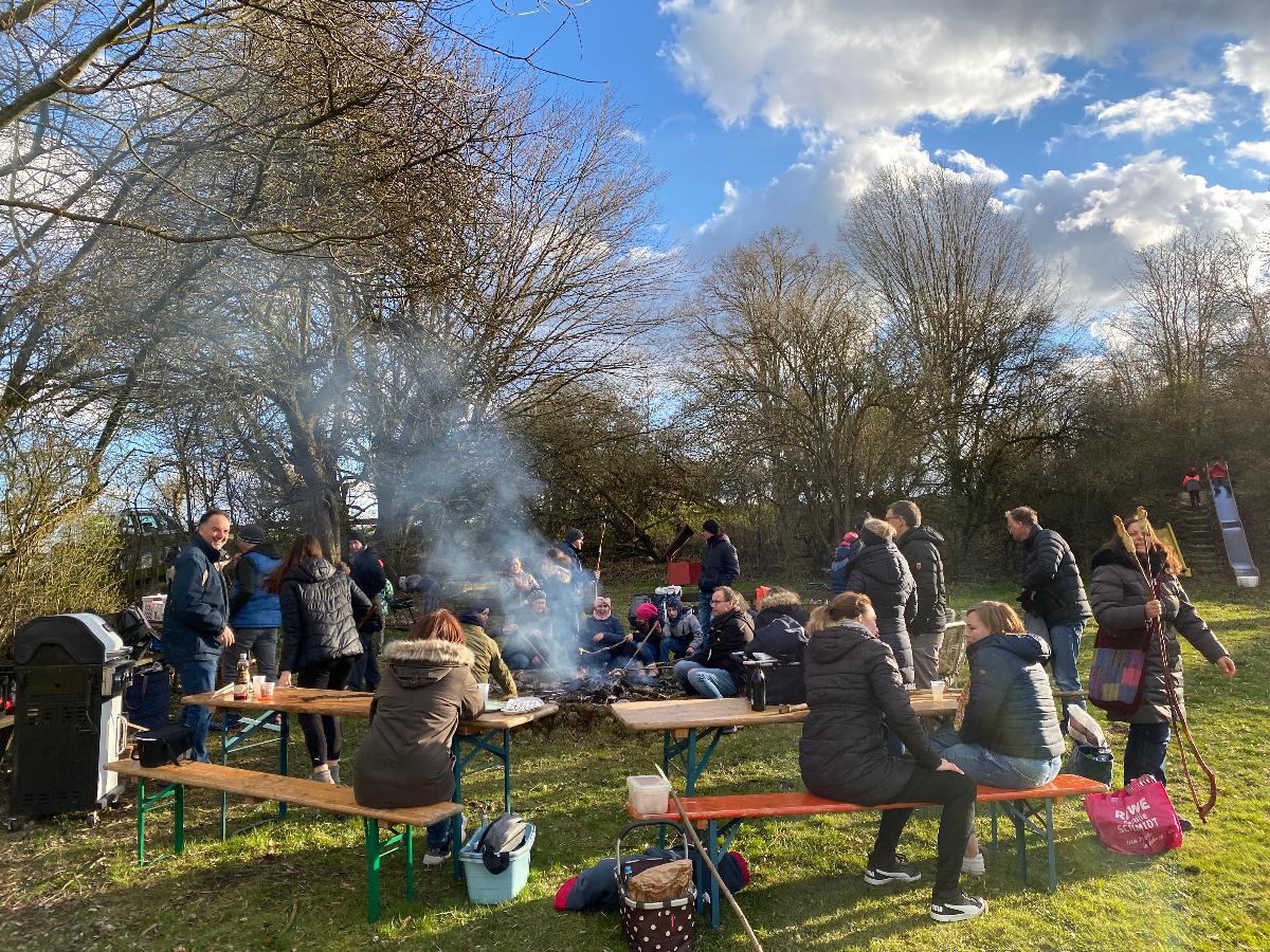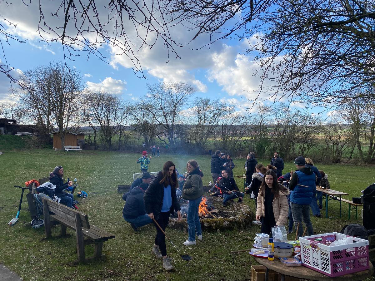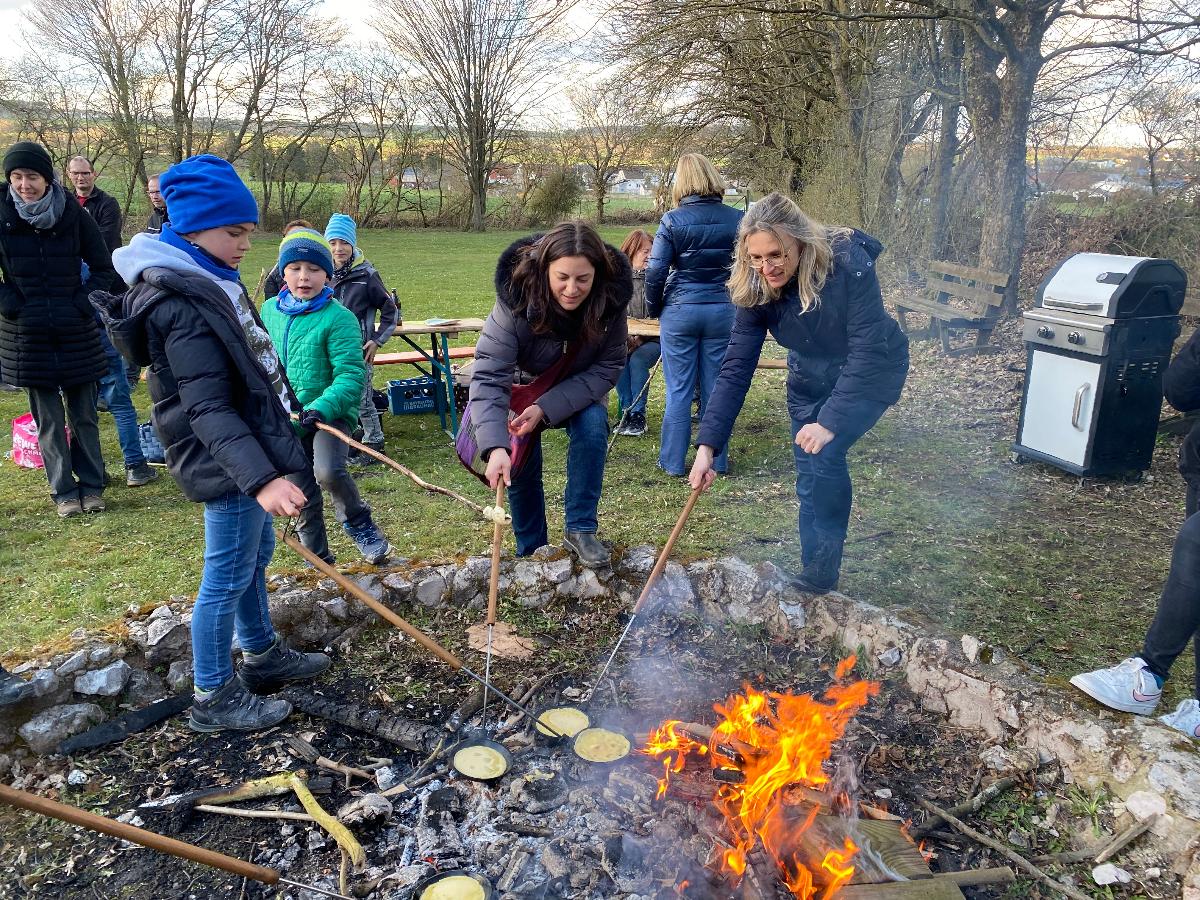 Einige Familien haben sich nach der Bastelaktion zum gemütlichen Beisammensein ums Lagerfeuer beim MCE versammelt. Hier gab es viele Leckereien vom Grill. Das Highlight für die Kids war dabei das Stockbrot-Grillen sowie auch das Pfannkuchen backen mit den Albvereins-Pfännchen aus Gusseisen, die direkt ins Feuer gehalten werden konnten. 10 Grillpfannen waren im Dauereinsatz bis auch der letzte Teigtropfen weg war.