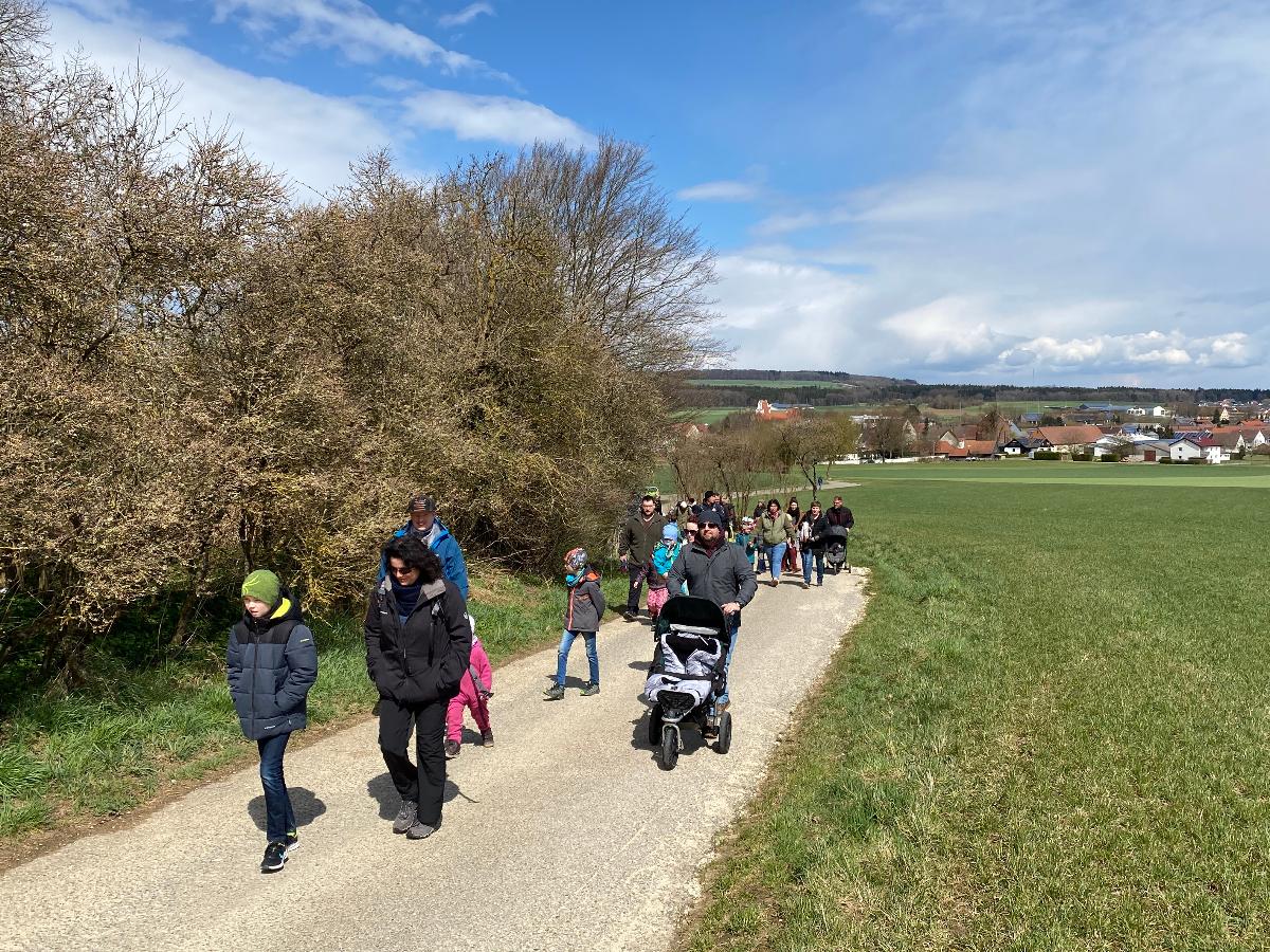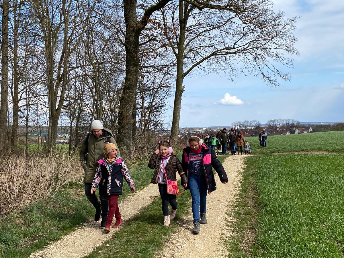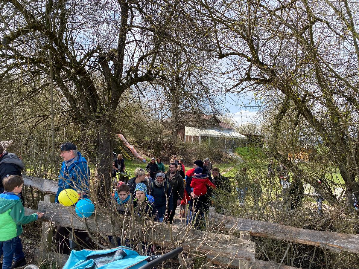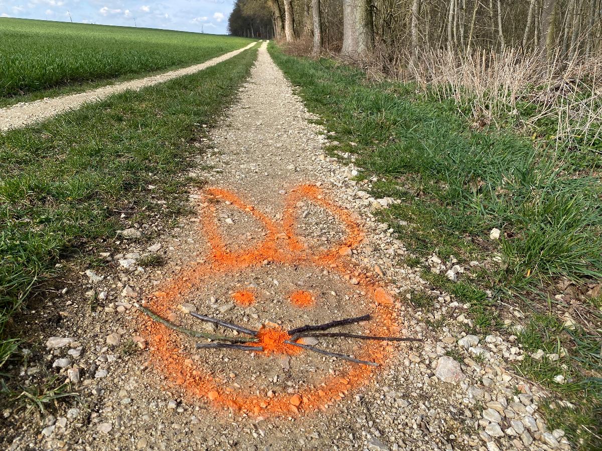 Am Sonntag um 14 Uhr startete die Oster-Schnitzeljagd. Ca. 30 Familien machten sich dabei auf die Suche nach den Osterhasen-Spuren – das waren mit Sprühkreide (die nach einigen Wochen wieder verschwindet) angebrachte Ostereier und Osterhasen als Wegmarkierung.
