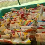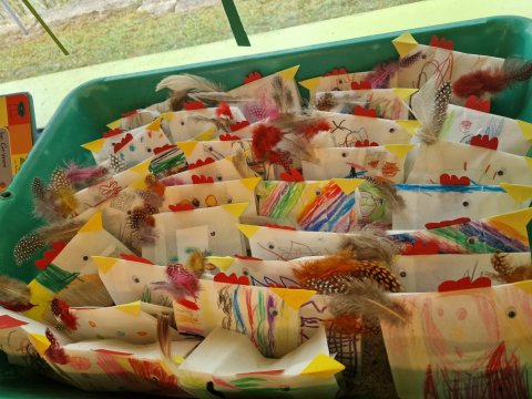 Aus weißen Butterbrottüten wurden mit viel Fleiß und Fantasie einzigartige, kunterbunte Hühner mit hübschen Federschwänzen.