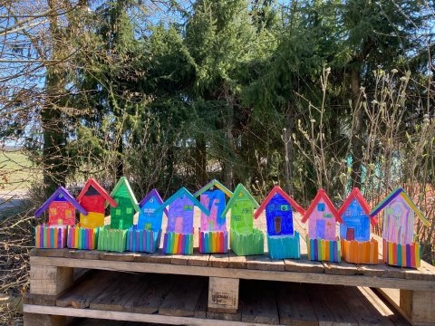 Aus sauber gespülten Tetrapacks wurden mit viel Fleiß und Fantasie einzigartige, kunterbunte Häuschen mit hübschen Holzzäunen, in deren Vorgarten demnächst auch die ausgesäte Kresse gedeihen wird.