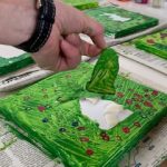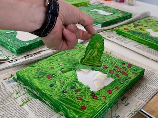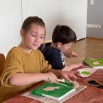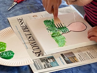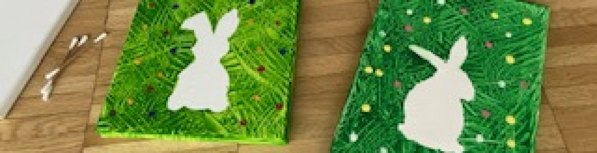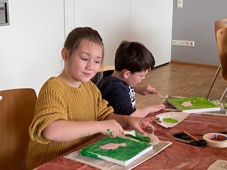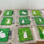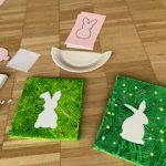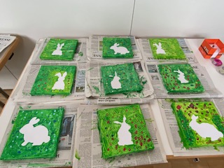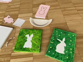 Wir haben mit 46 kreativen Kindern in 3 Gruppen – bei den Jüngeren, teilweise mit der Unterstützung von Mama oder Oma – wunderschöne Osterhasen-Leinwände gestaltet. Dabei sind wundervolle Bilder mit „Gabeltechnik“ entstanden.