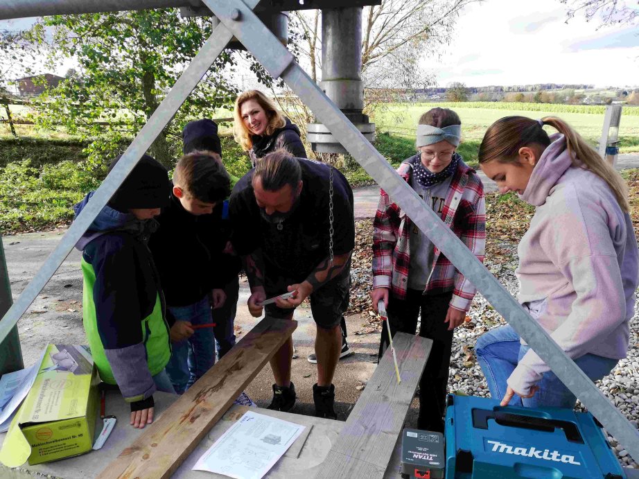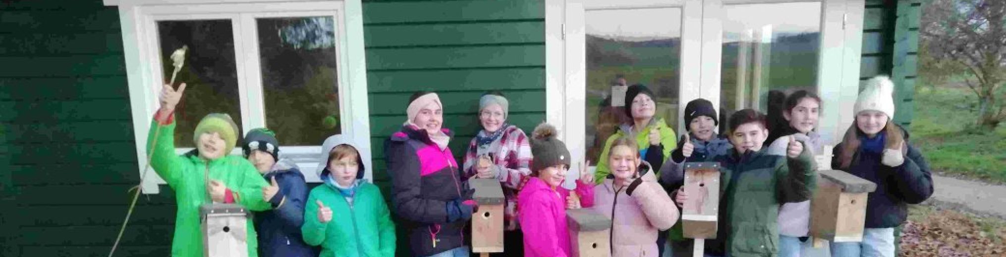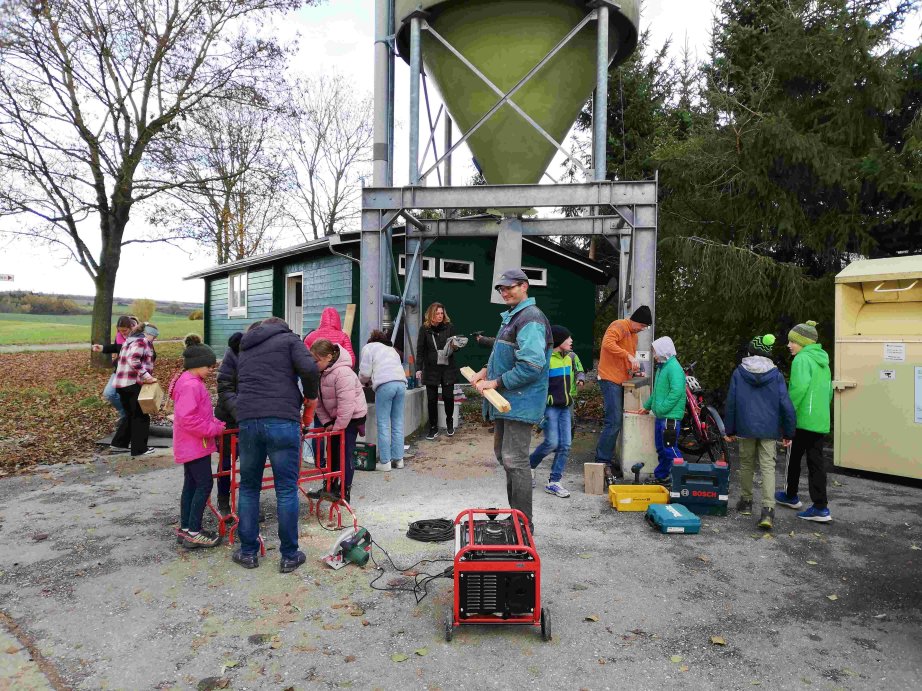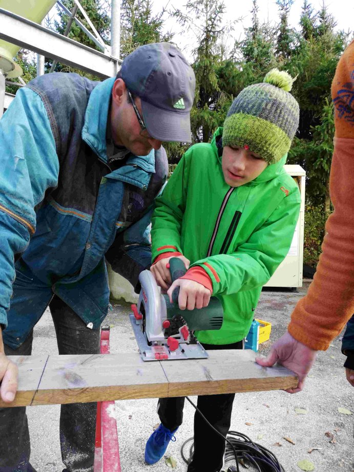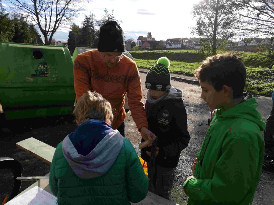 Am letzten Samstag bauten bei kühlem, freundlichen Novemberwetter 12 Kinder und ein paar Erwachsene in Kleingruppen insgesamt 5 Nistkästen. Los ging‘s am Jugendtreff am frühen Nachmittag. Zuerst mussten die benötigten Teile aufgezeichnet werden. Anschließend durften die Kinder unter Aufsicht die Bretter selbst zuschneiden und die Vogelhäuschen zusammenschrauben. Über den Durchmesser des Loches an der Vorderseite können die zukünftigen Bewohner gesteuert werden (Blaumeisen kommen durch Löcher ab 26 mm, Spatzen benötigen mindestens 35 mm). Nachdem die Nistkästen fertig waren, wurde der Tag am Lagerfeuer mit Stockbrot beendet. Wem es zu kalt wurde, konnte sich im Jugendtreff etwas aufwärmen.