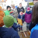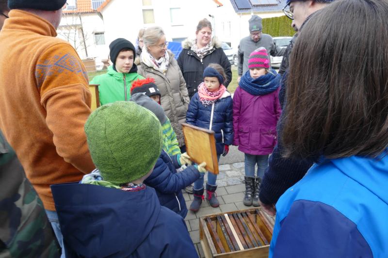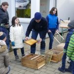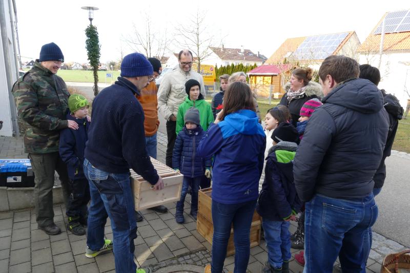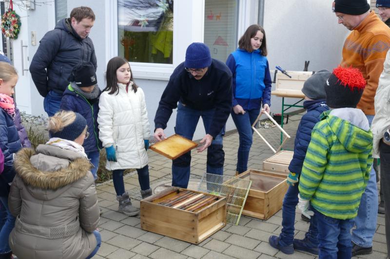 Doch bevor die tatkräftigen kleinen und großen Helfer loslegten, wurde ein bisheriger Bienenkasten, auch Bienenbeute genannt, genauer betrachtet und als Bauvorlage verwendet.