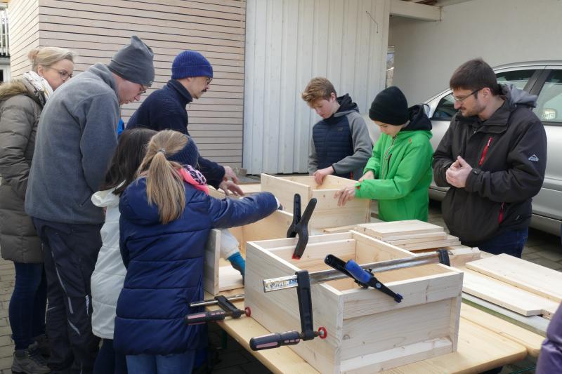 Am Sonntag, 16. Februar 2020 versammelten sich 8 Familien auf dem Stellplatz von Familie Künster, um für die vereinseigenen Bienen neue Bienenzargen zu bauen.