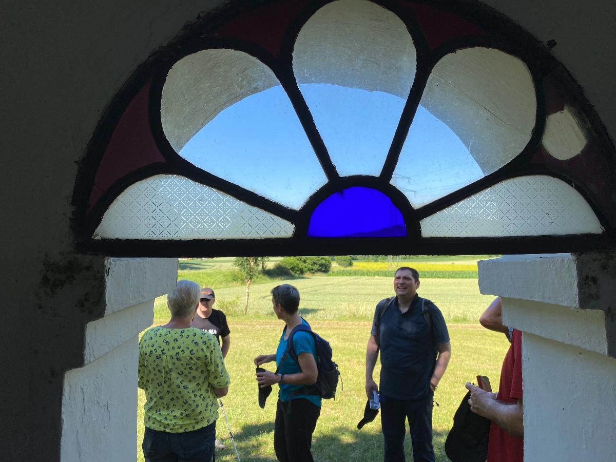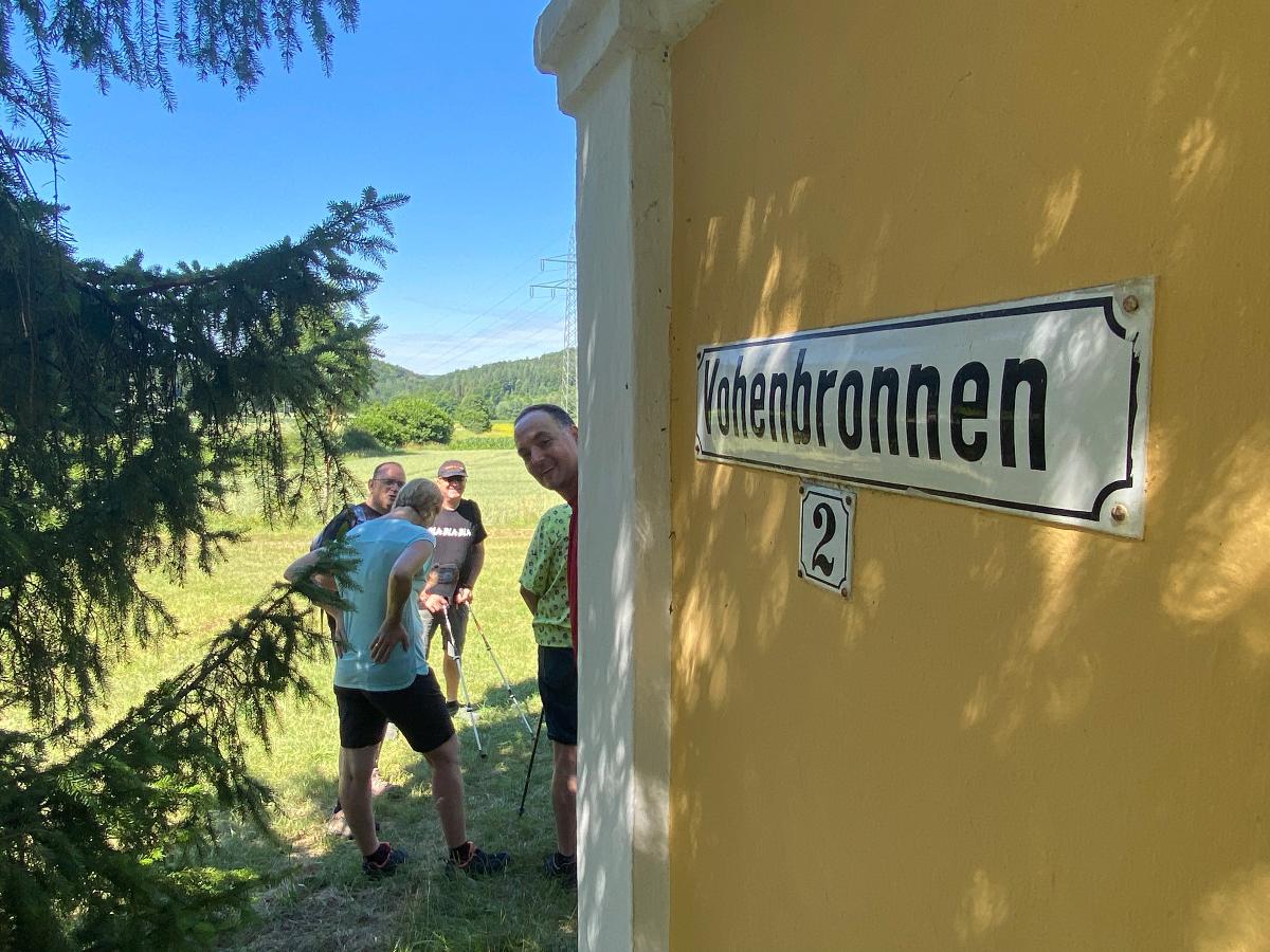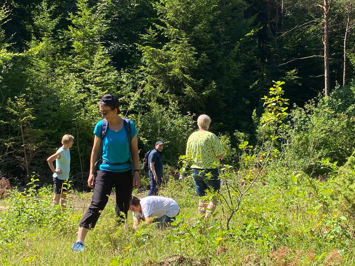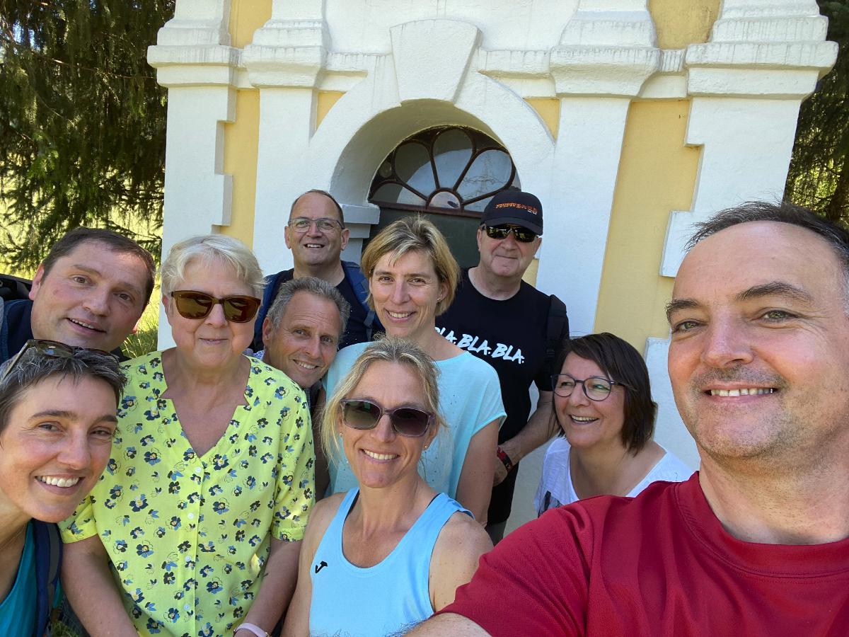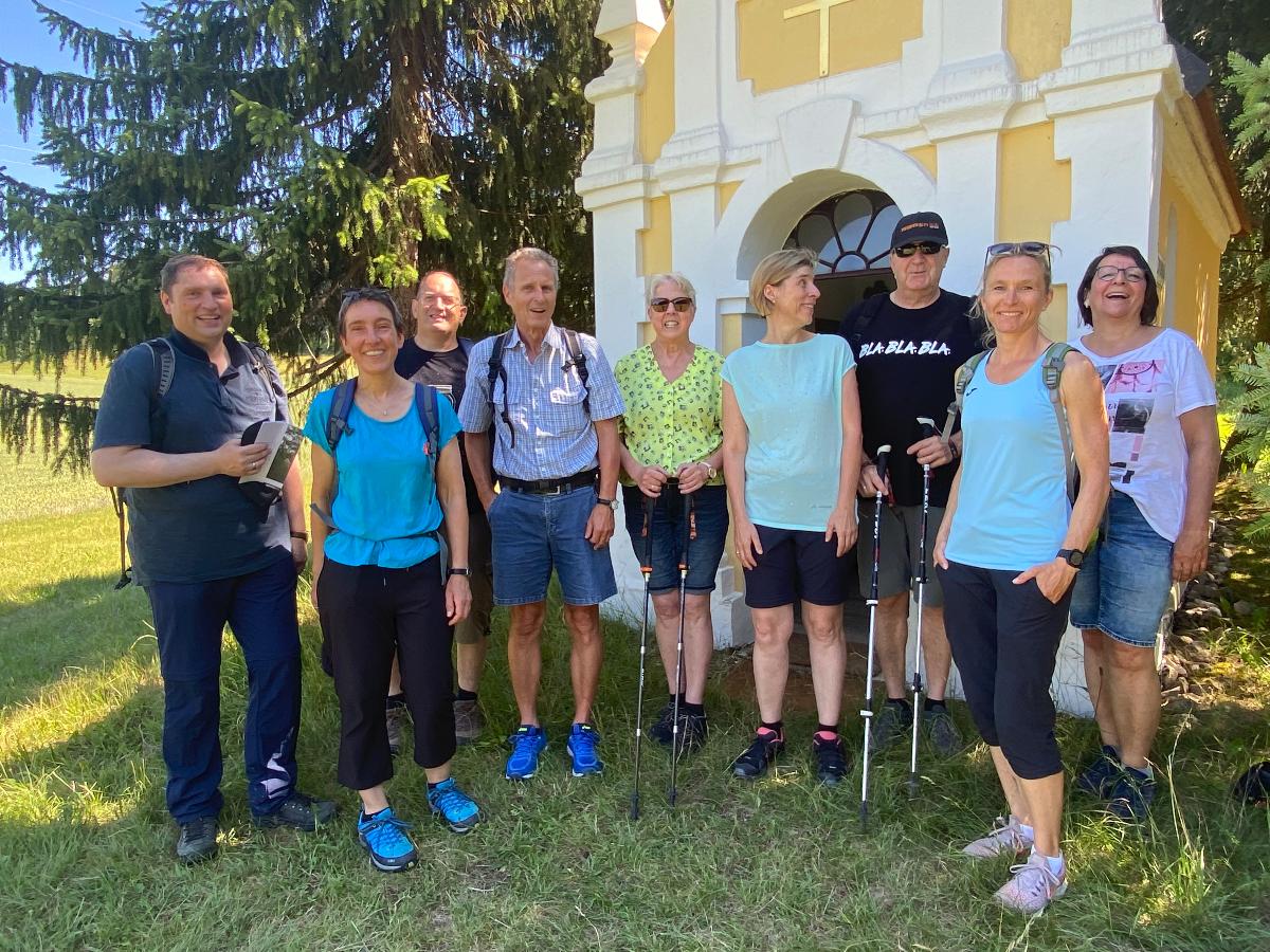 Pünktlich um 10 Uhr starteten 10 Albvereinsmitglieder bei heißen Sommerwetter am Parkplatz „Birkenlauhhalle Ringingen“ mit der Orchideenrunde. 6 Wandernde waren dabei schon „warm“, da sie von Einsingen aus per Fahrrad zum Treffpunkt gefahren sind. Highlight der Tour war die Wildorchideenwiese, auf er wir uns intensiv auf die Suche nach Orchideen und Liliengewächsen machten. Des weiteren fanden wir besonders schön die Kapelle am Vohenbronnen, die uns Schatten spendete und bei der das beigefügte Selfi entstand (außer uns waren keine anderen Wanderer unterwegs, die uns hätten fotografieren können), die Sonnenliege am Waldrand und der Seerosenweiher mit vielen blühenden Seerosen, sowie quakenden und aktiven Fröschen. An der „Erlenbachquelle“ sind wir wohl vorbeigerannt, zumindest haben wir sie während unserer vielen netten Gespräche unterwegs nicht wahrgenommen.