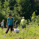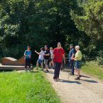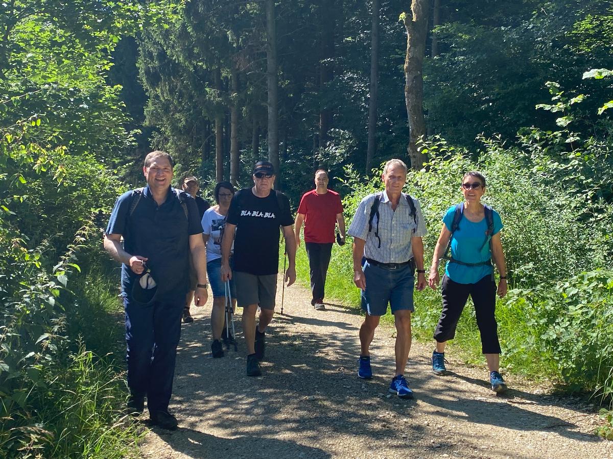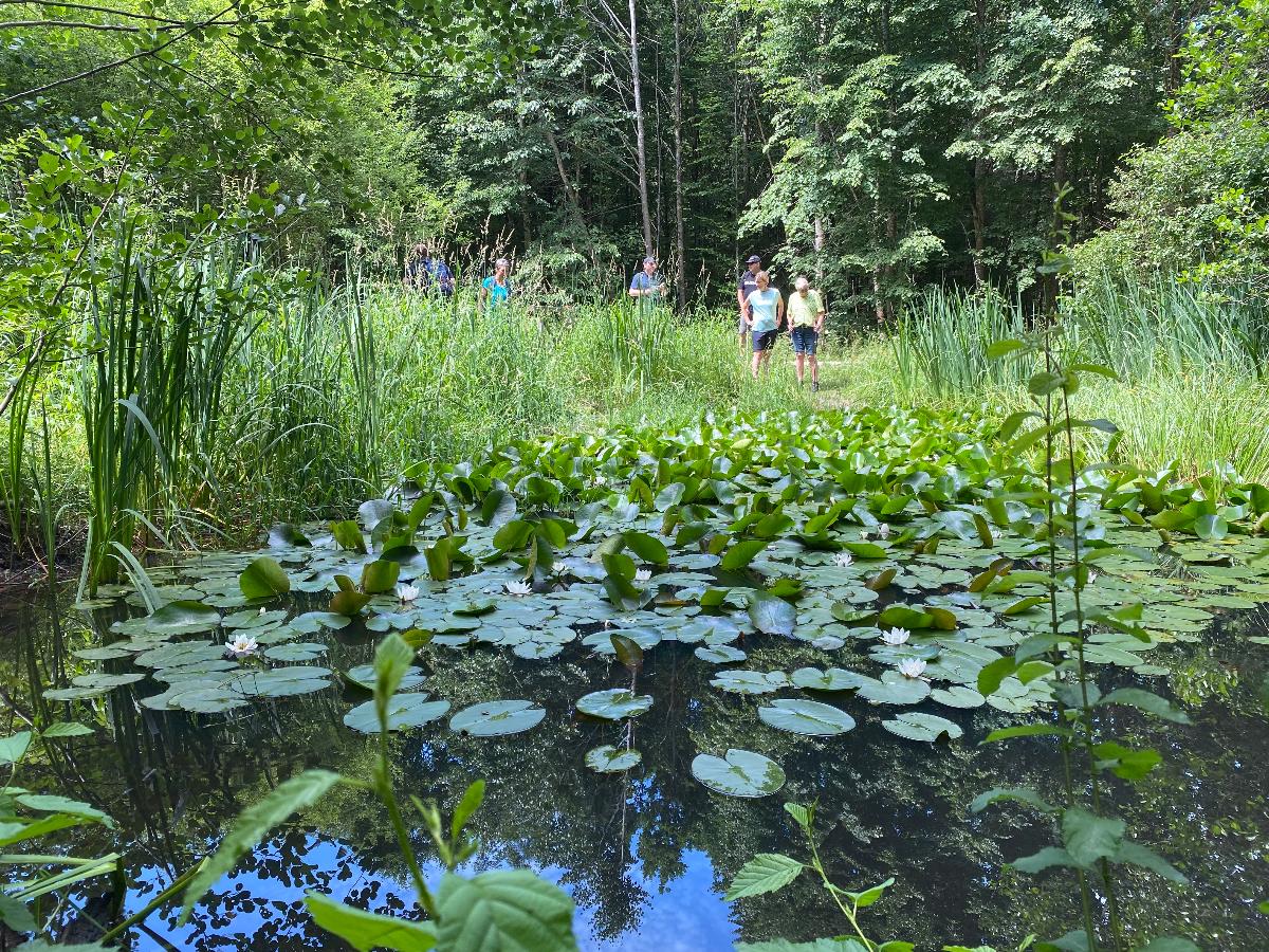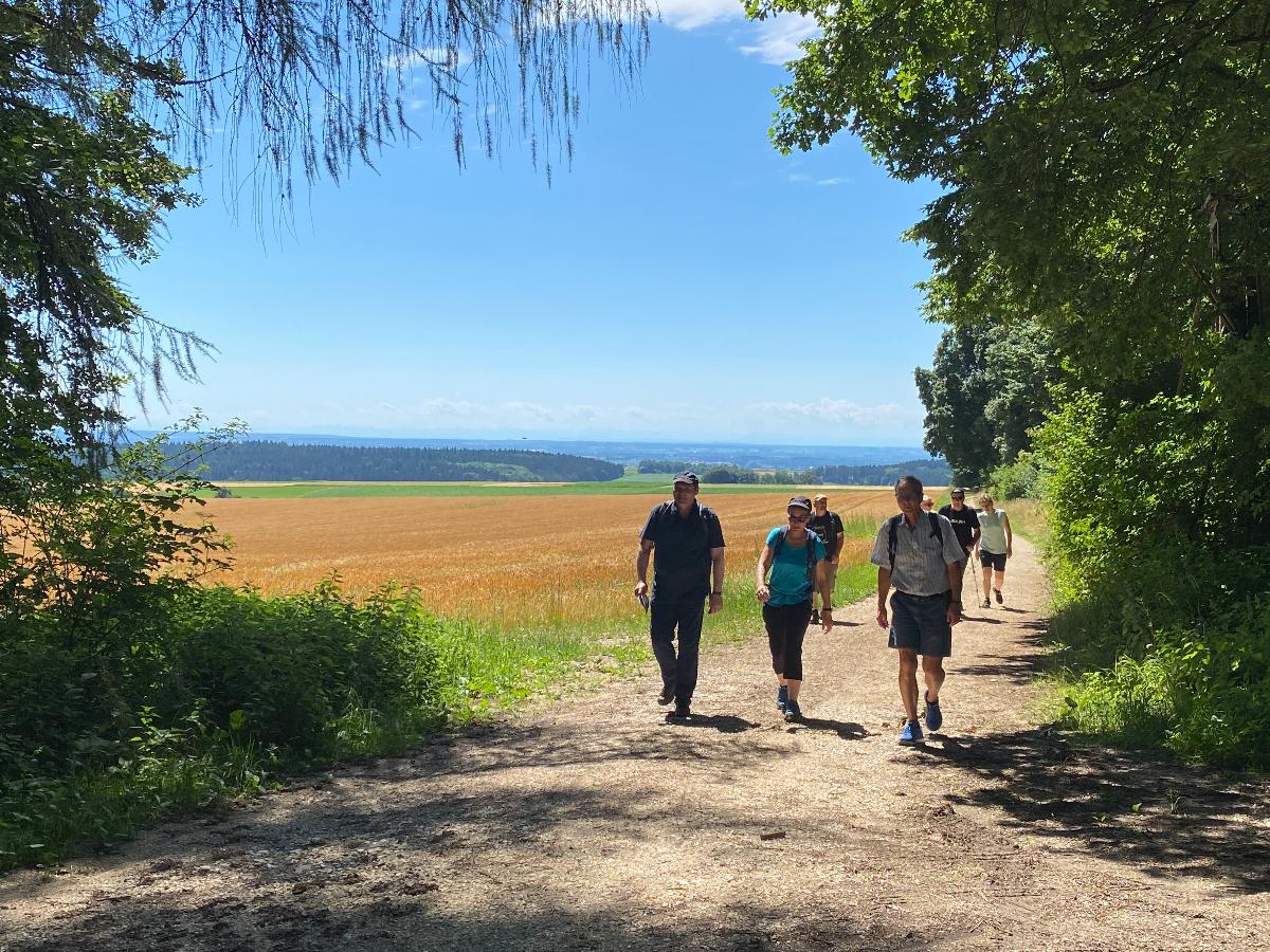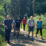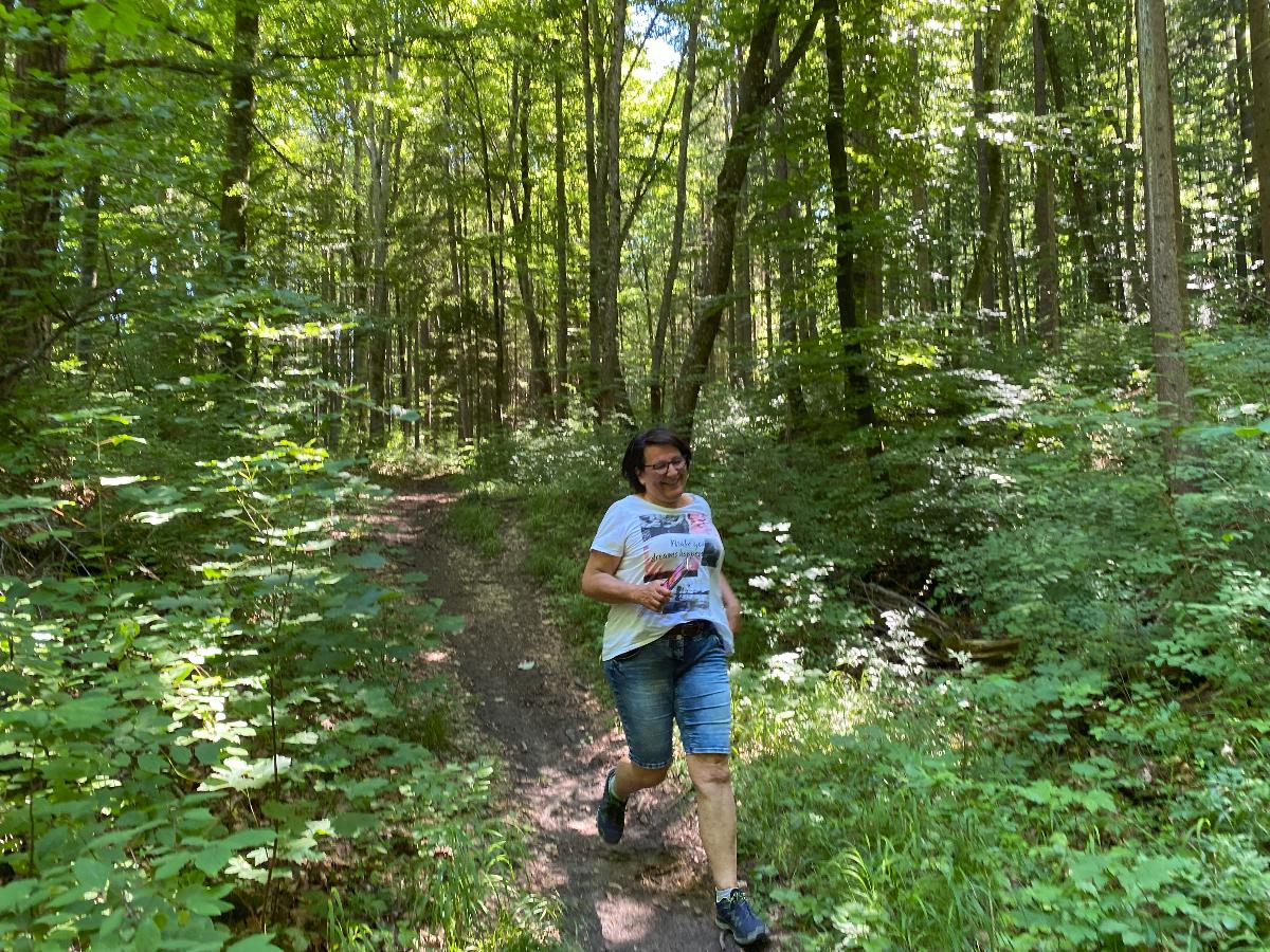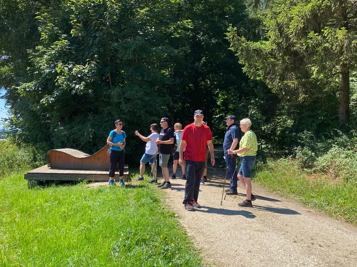 Pünktlich um 10 Uhr starteten 10 Albvereinsmitglieder bei heißen Sommerwetter am Parkplatz „Birkenlauhhalle Ringingen“ mit der Orchideenrunde. 6 Wandernde waren dabei schon „warm“, da sie von Einsingen aus per Fahrrad zum Treffpunkt gefahren sind. Highlight der Tour war die Wildorchideenwiese, auf er wir uns intensiv auf die Suche nach Orchideen und Liliengewächsen machten. Des weiteren fanden wir besonders schön die Kapelle am Vohenbronnen, die uns Schatten spendete und bei der das beigefügte Selfi entstand (außer uns waren keine anderen Wanderer unterwegs, die uns hätten fotografieren können), die Sonnenliege am Waldrand und der Seerosenweiher mit vielen blühenden Seerosen, sowie quakenden und aktiven Fröschen. An der „Erlenbachquelle“ sind wir wohl vorbeigerannt, zumindest haben wir sie während unserer vielen netten Gespräche unterwegs nicht wahrgenommen.