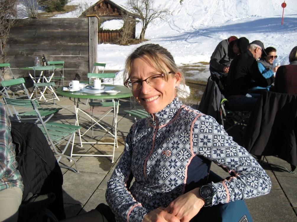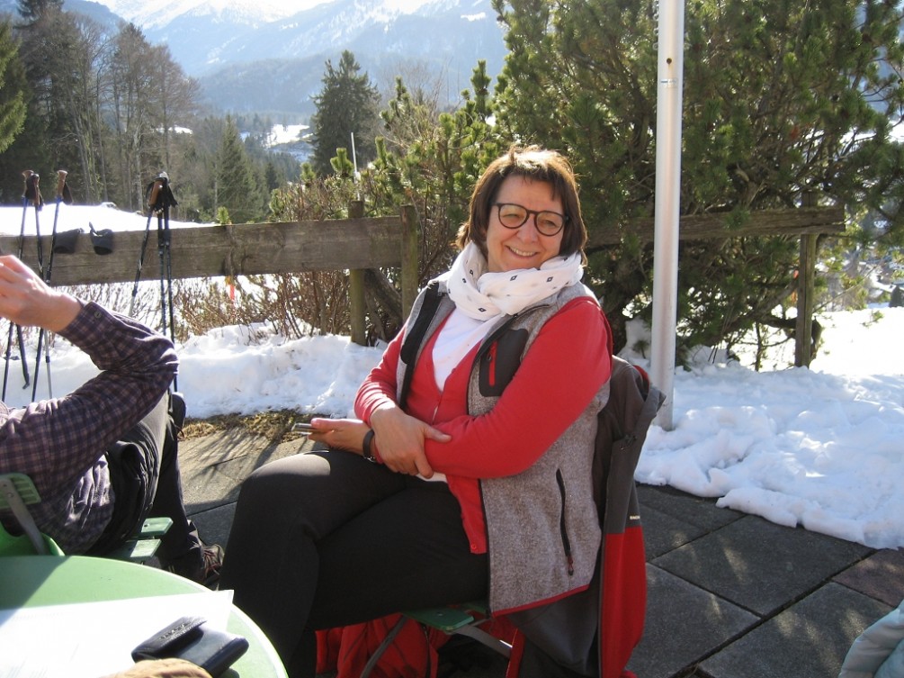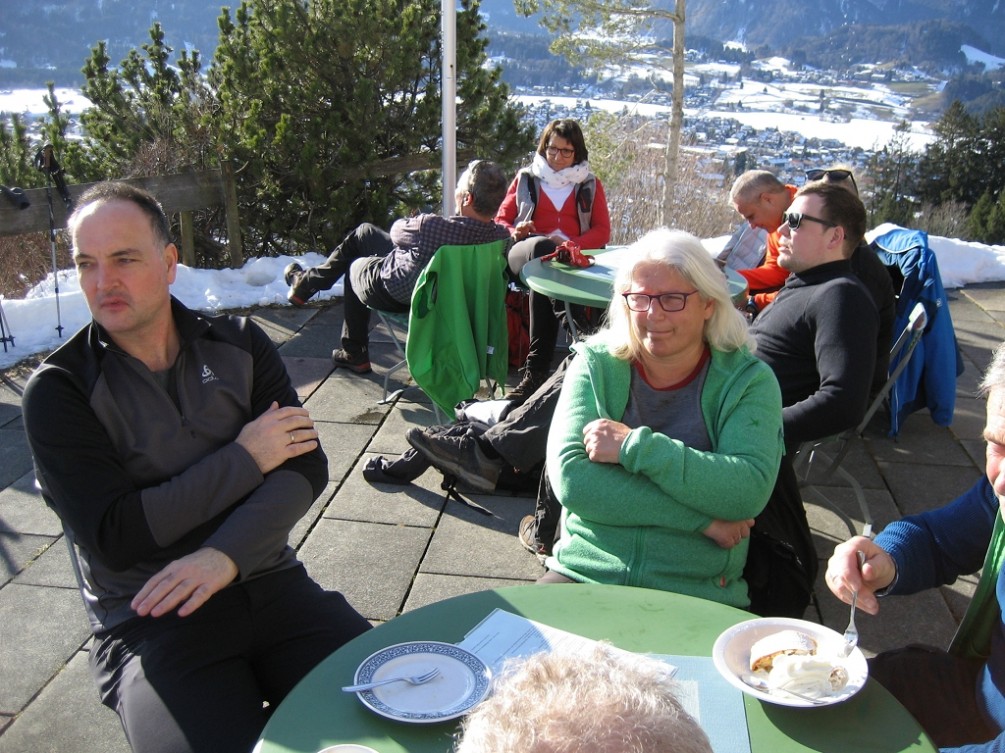 Pünktlich zur Mittagszeit hatten wir unser Ziel, die Gaisalpe, erreicht. Die leckere Auswahl an Gerichten haben alle genossen – vom Käseknödel, Brotzeit und Bergfladen – alles war sehr gut. Nach der langen Mittagspause ging es wieder zurück nach Oberstdorf. Unseren ursprünglich geplanten Rückweg über die Fahrstraße nach Reichenbach haben wir kurzentschlossen geändert, da der Weg abwärts leider zu rutschig war. Also wählten wir als Rückweg wieder den Weg, auf dem wir gekommen waren.