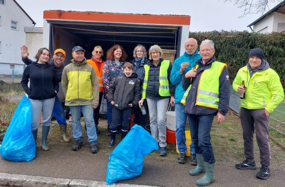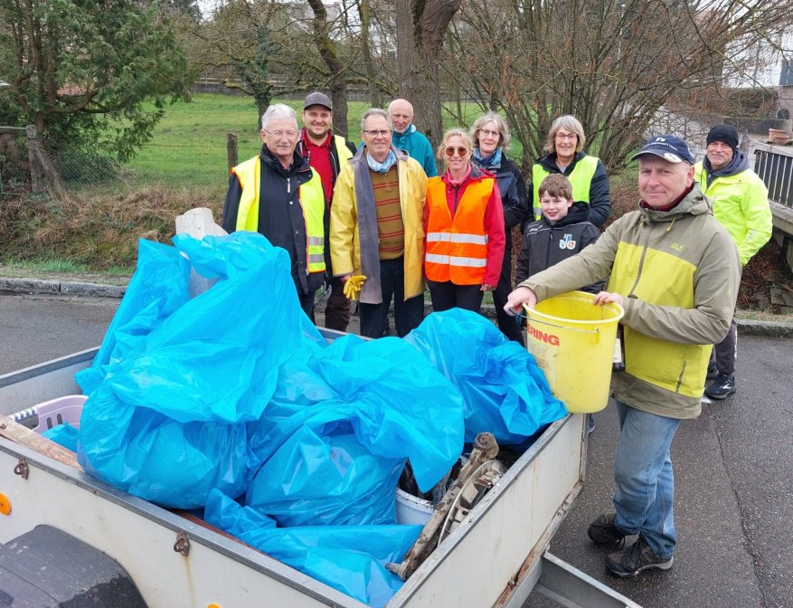 Bei anfangs regnerischen Frühlingswetter konnten wir trotzdem die geplante Putzete am Samstag den 29.03.2025 durchführen. Am Treffpunkt „Garage des SAVs“ fanden sich 14 Personen (1 Kind, 2 Jugendliche und 11 Erwachsen) ein. Schnell waren die Teams definiert und die Bereiche „Müllsuche“ eingeteilt. Wir haben von Papier, Zigarettenschachteln, Kippen, Medikamentenblister, Dosen, Glas- und Plastikflaschen, Radkappen und alles Mögliche gefunden und eingesammelt. Highlights waren: PC-Tastatur, Spielsachen, WC-Bürste, Mäuseschädel, Dreieckslenker PKW-Vorderachse. Bis ca. 11:00 Uhr hatten wir einen PKW-Anhänger voller Müll zusammengetragen. Ein anschließender Imbiss war wohl verdient.