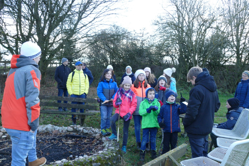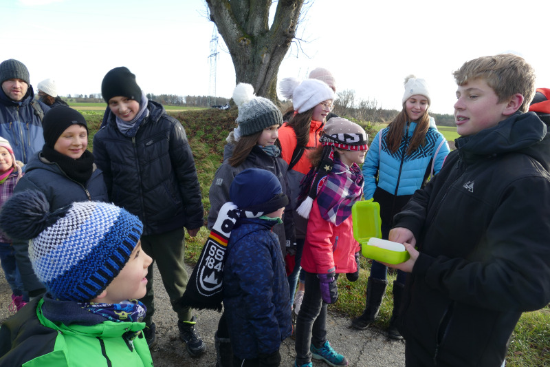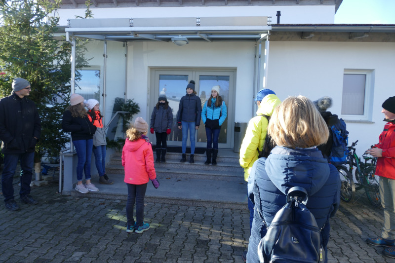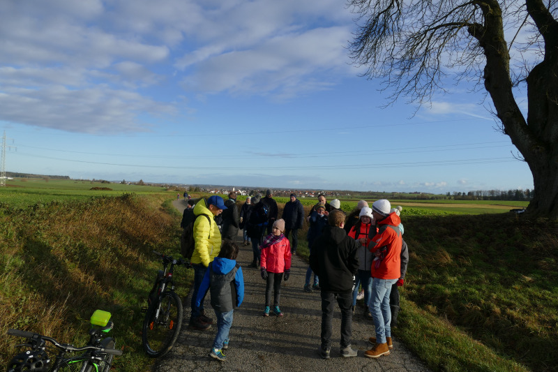 Am Samstag, 14.12.2019 versammelten sich 25 Mitglieder der Familiengruppe um 14 Uhr vor dem Musikerheim zur Weihnachtswanderung, trotz des stürmischen und unbeständigen Wetters! Gut eingepackt, die Mützen über beide Ohren gezogen, gab es Informationen zum Ablauf der Wanderung durch das Organisations-Team. Dieses Team, bestehend aus 6 Teenagern bzw. Jugendlichen der Familiengruppe, hat sich wie im Vorjahr tolle kindgerechte Aktionen und einer dem Wetter angepassten Wanderstrecke für die Weihnachtswanderung einfallen lassen. Die Tour führte uns über den Sandweg Richtung Eggingen, dem Radweg folgend Richtung Erbach, weiter über einen Feldweg Richtung „Alte Turnhalle“ und dem Wasenweg über den Kirchplatz wieder zurück ins Musikerheim.