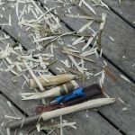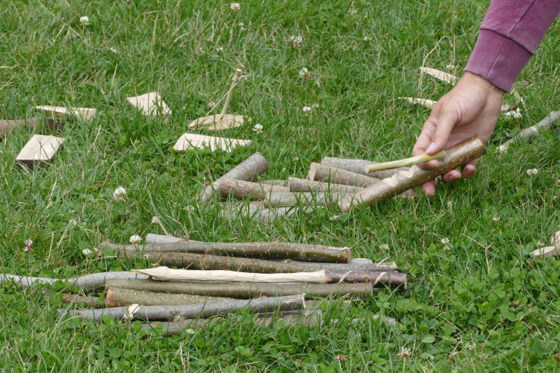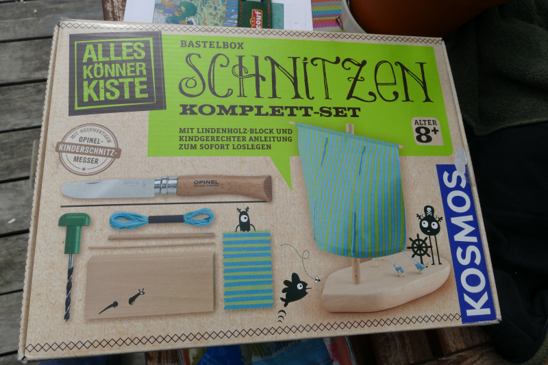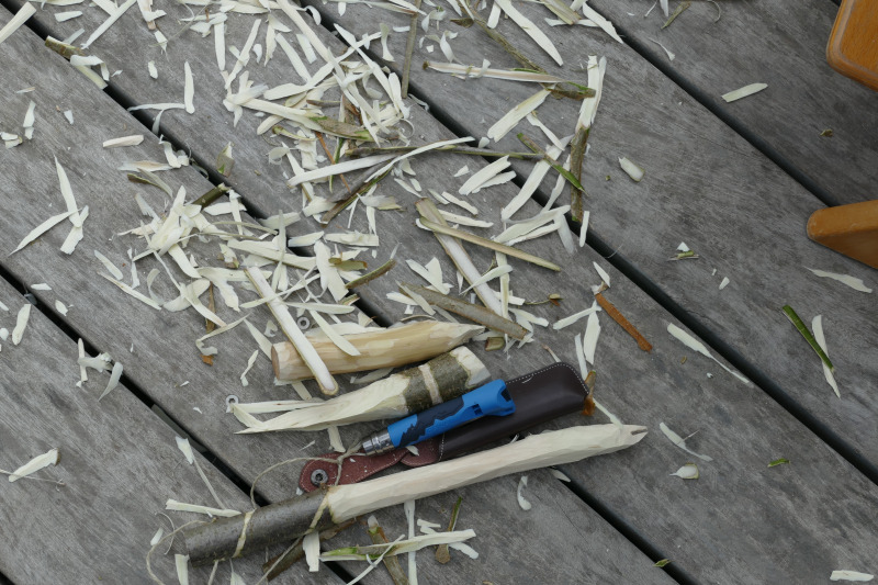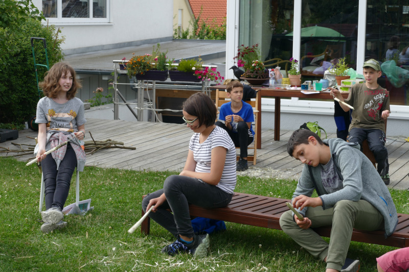 Erproben konnten sich die 12 teilnehmenden Kinder in 3 Techniken des Schnitzens (Stopp-/Fein-/Grobschnitt) an einem Haselnuss-Stecken, aus dem Sie eine Grillgabel schnitzten. Des Weiteren wurden Gabeln, Messer, Löffel, Kreisel, Schiffe, Astkröten oder andere Eigenkreationen angefertigt, sodass in den 3 Stunden einiges an Spänen gefallen war.