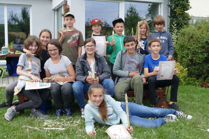 Über diese konnten sich dann die Hasen im Garten erfreuen, die nun einige Tage lang etwas zum Knabbern haben. Bevor die stolzen Kinder Ihre geschnitzten Gegenstände ihren Eltern zeigen konnten, gab es abschließend noch ein großes Lob des Naturpädagogen. Alle Kinder erhielten auch ein Schnitz-Diplom (das gibt es nur, wenn man sich an die Regeln hält) und natürlich einen Stempel in den Albvereinspass.