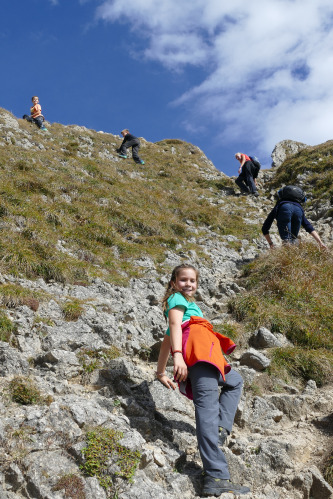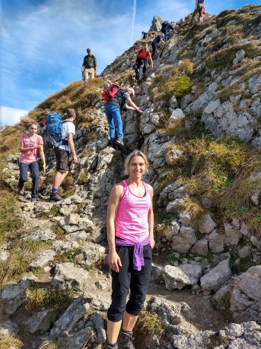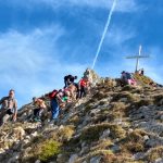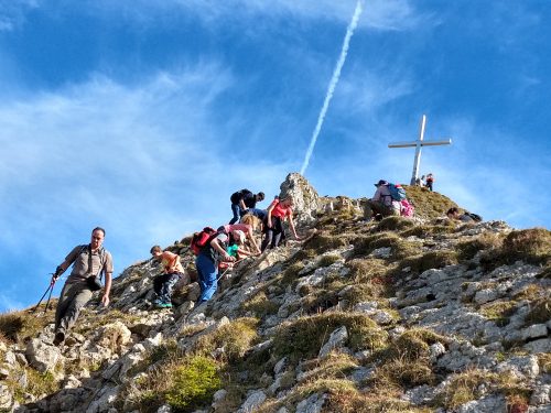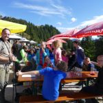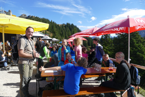 Ein Großteil der Gruppe kehrte im Tegelberghaus ein. Eine kleinere Gruppe hatte sich noch den 1.880 m hohen Gipfel des Branderschrofen mit einem kleinen Klettersteig als weiteres Ziel gesetzt und war mächtig stolz, am Gipfelkreuz zu stehen und den Weitblick ins Alpenvorland mit den zahlreichen Seen von hier aus zu genießen.