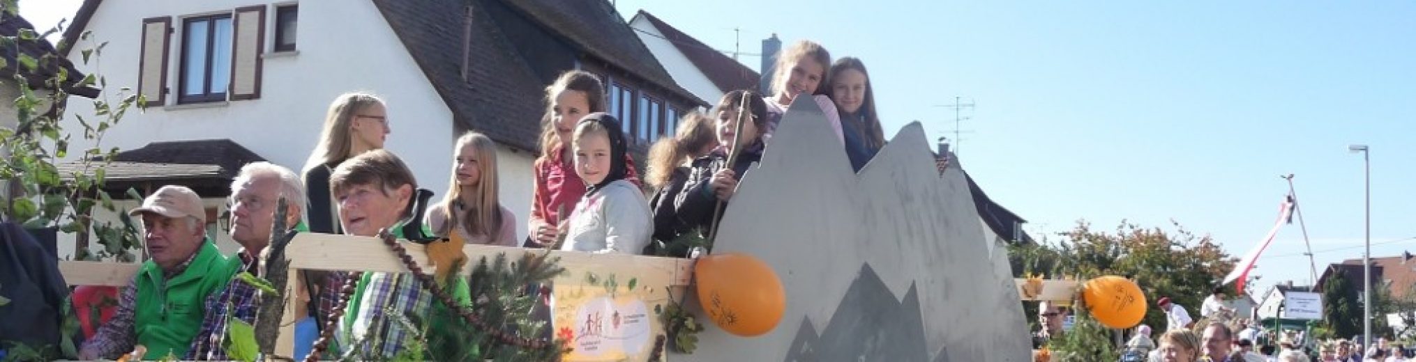 Es war ein buntes Treiben zu bestaunen. Getreu dem Motto „Alt und Jung“ fuhren auf dem Wagen auch langjährige Mitglieder mit. Martin Klöble zog unseren Wagen mit Hilfe seines Traktors. Die Eltern aus der Familiengruppe und Mitglieder vom Verein begleiteten den Wagen als „wanderndes Volk“. Gemeinsam haben wir unsere „Wanderung“ im Festzelt beendet.