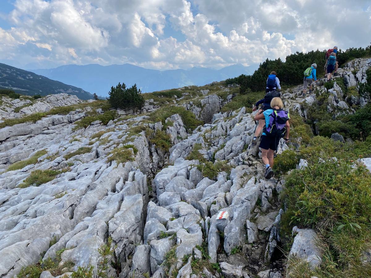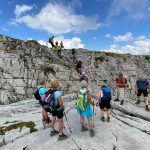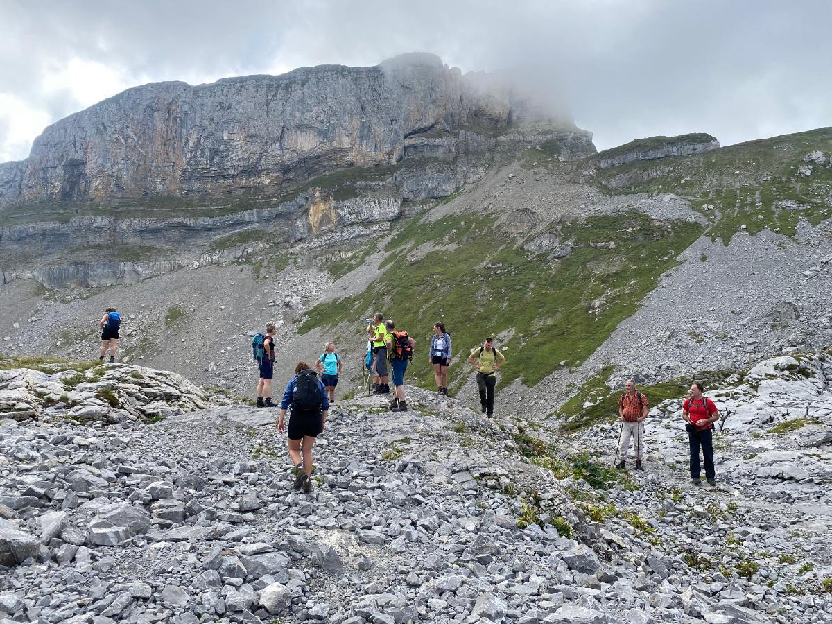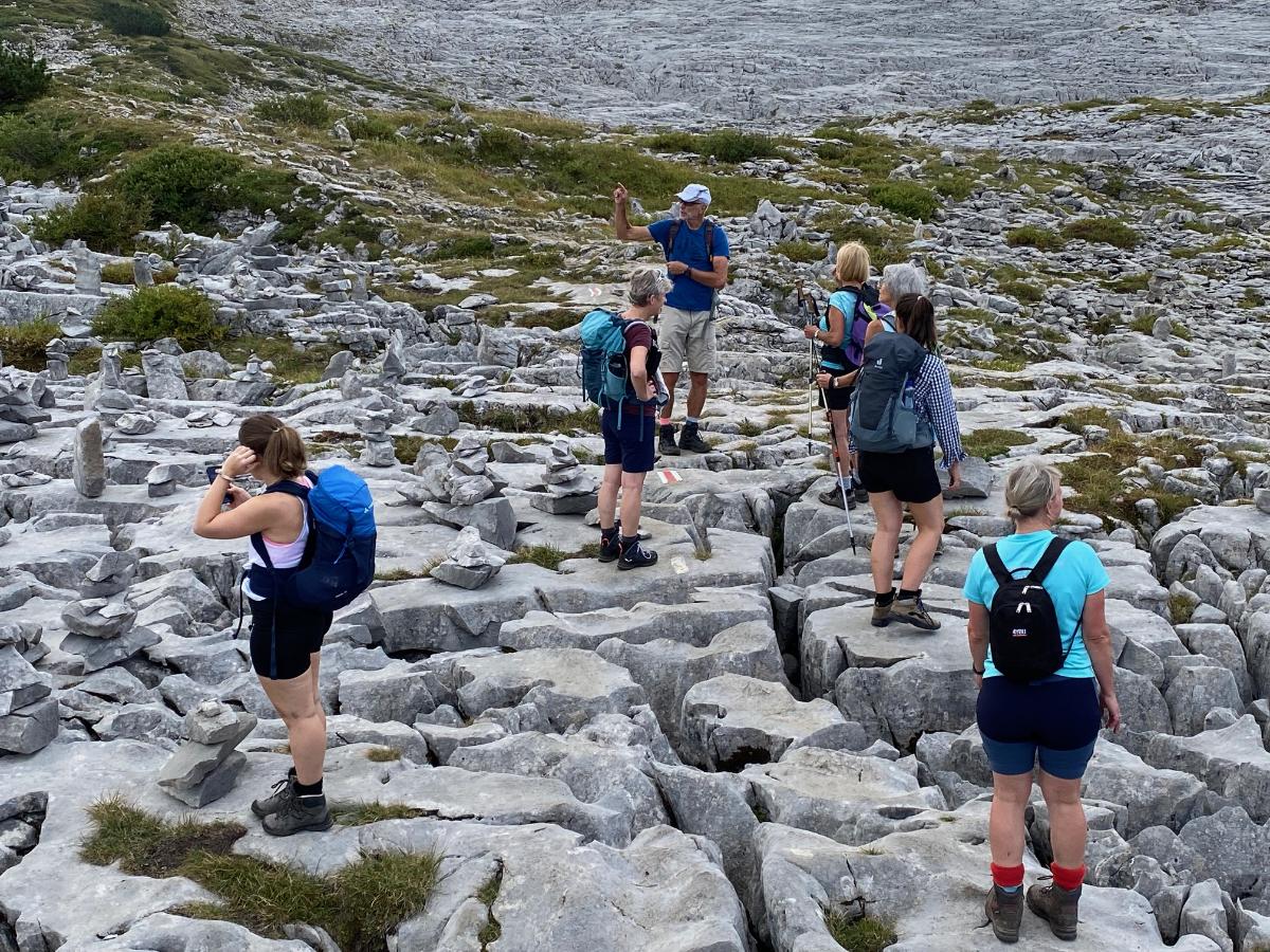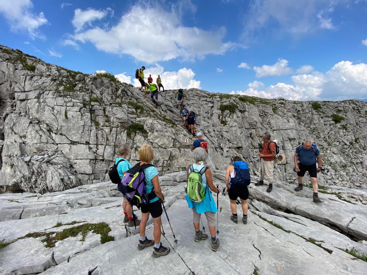 Erst gab es nur 6 Anmeldungen, doch dann hatten sich viele Kurzentschlossene nicht nur wegen des tollen Sommerwetters sondern auch wegen der Einzigartigkeit der dortigen Landschaft für die Tour angemeldet. Insgesamt waren wir dann 16 Wanderer. Unser Wanderführer Gerd führte uns nicht so, wie die meisten Tourenempfehlungen es vorsehen, sondern „andersherum“, d.h. wir wanderten übers Oberwäldele den Berg hinauf. Es ging über viel Schrattenkalk durch die wild zerklüftete Karstlandschaft des Gottesackerplateaus  bis hinauf zur Bergstation des Ifenlifts. Der Gang über das Plateau erforderte volle Aufmerksamkeit, um nicht in eine der vielen Felsspalten zu treten. An einigen Stellen waren wir auch auf allen Vieren unterwegs. Oben angelangt hatten wir den eindrucksvollen Blick auf die steilabfallenden Wände des Ifen. Hinunter ging es an der Ifenbahn vorbei und die letzten 300 Höhenmeter auf naturnahen Wegen zurück zum Ausgangspunkt, dem Ifen-Parkplatz. Da es unterwegs keine Einkehrmöglichkeit gab, freuten wir uns umso mehr auf ein kühles Getränk und ein leckeres Essen in der Auenhütte. Und der ein oder andere Wanderer freute sich auch darauf, nach 8 Stunden (Wanderdauer 9-17 Uhr) endlich aus den Bergschuhen herauszukommen. Einen Wanderer gab es, der sich für die nächste Tour neue Wanderschuhe besorgen muss, denn nach 1,5 Stunden Wanderung hatte sich zuerst die rechte, dann die Linke Sohle vom Schuh gelöst. Glücklicherweise konnten wir diese mit diversen (Klebe-)Bändern notdürftig reparieren, sodass wir die Tour zusammenbleibend in der Gruppe durchführen konnten.