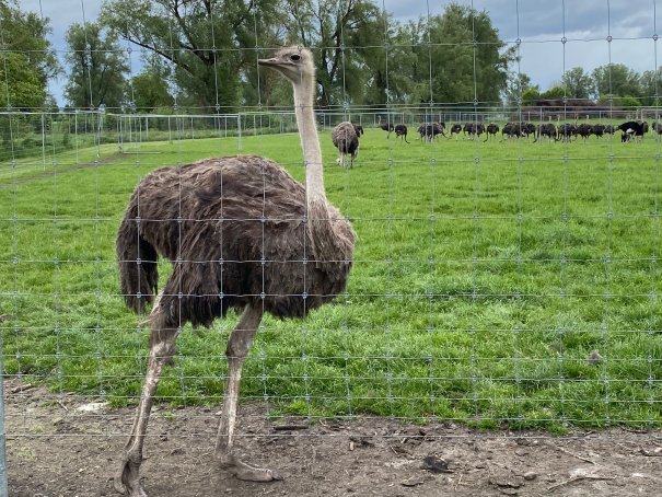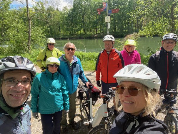 Unser Tourguide Wolfgang führte uns 8 Radelnde auf ca. 78km Strecke wie immer sehr souverän über Thalfingen, Elchingen und Weißingen ins Langenauer Ried und Leipheimer Moos. Bis zum Aussichtsturm im Naturschutzgebiet Leipheimer Moos schafften wir es auch im Trockenen, hatten den Blick auf tierische Begleiter, wie Wildgänse, Enten, einige aufplusternde Strauße und konnten auch einen Feldhasen hoppeln sehen. Die Regenwolken blieben bis dahin hinter uns und wir nutzten die Vesperpause auf dem Aussichtsturm im Günzburger Moos zur kleinen Stärkung. Doch dann kamen wir um Regenkleidung nicht herum und starteten den zweiten Teil der Tour in Richtung Leipheim bei etwas Niederschlag. Es dauerte aber nicht mehr lange, dann wurde es wieder warm und trocken und wir konnten uns von Regenjacke und Hose wieder befreien. Das Spielchen mit „An- und Ausziehen“ machten wir dann noch das ein oder andere Mal, als das „Mai-Wetter“ wieder zum „April-Wetter“ wurde. Bei starkem Gegenwind am Donauufer-Radweg aber leichtem Sonnenschein waren wir Analogfahrer dankbar, dass die E-Bike-Radelnden uns ausreichend Windschatten bieten konnten und der Rückweg nach Einsingen somit auch für alle sehr entspannt verlief. Da wir aufgrund des Wetters niemanden fürs Gruppenfoto schießen finden konnten, ist deshalb das beigefügte Selfi entstanden und auch das Bild des eher kritisch schauenden Vogelstrauß.