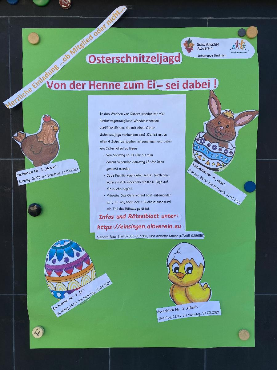 Die Einsinger Oster-Aktion „Von der Henne zum Ei – sei dabei!“ war eine Corona konforme Oster-Schnitzeljagd der Familiengruppe, die familienintern durchgeführt werden konnte.
