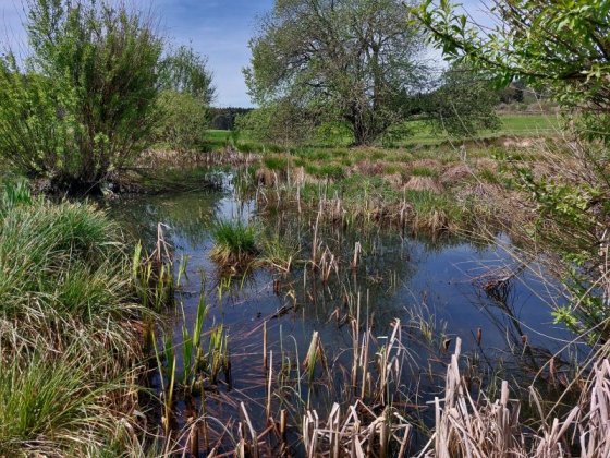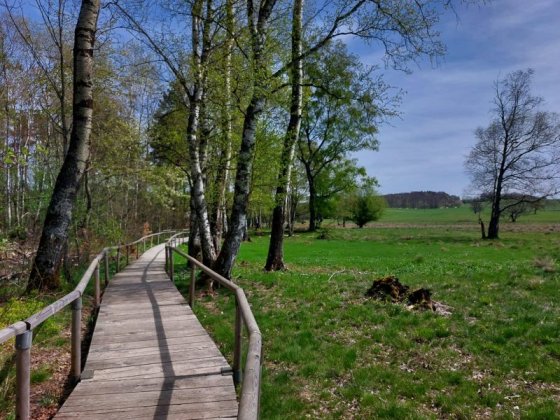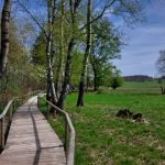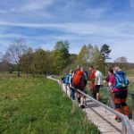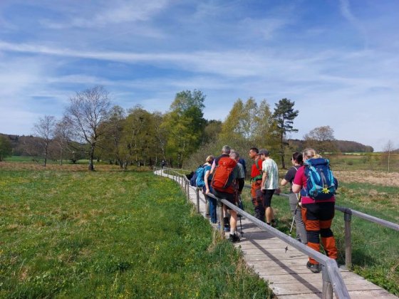 Bei fast sommerlichen Temperaturen fanden sich 10 Wanderer mit den Hunden Rudi und Teddy am Treffpunkt ein. Vom Parkplatz „Gänskragen“, unweit des Schopflocher Moores, startete unsere Rundwanderung. Vorbei am Otto-Hofmeister-Haus ging es direkt über den neuen Holzsteg durchs das Schopflocher Moor. Das Torfmoor ist ein verlandeter Maarsee und hier wurde ab Ende des 18. Jahrhunderts Torf abgebaut. Der Schwäb. Albverein erwarb das Moor im Jahr 1931 und pflegt und erhält es seither mit unseren Mitgliedsbeiträgen.
