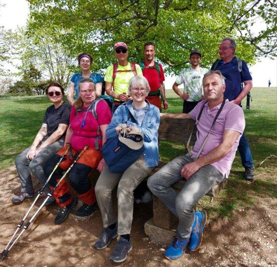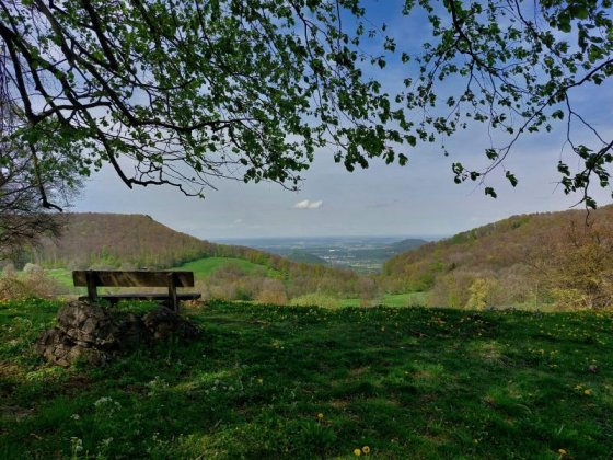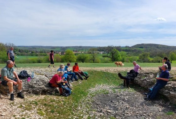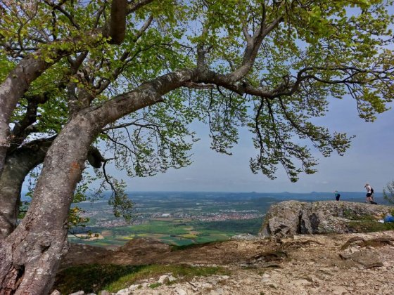 Nach einer kurzen Pause wanderten wir weiter zum 811m hohen Breitenstein, einem grandiosen Aussichtspunkt am Albtrauf über Bissingen. Von dem ca. 200 Meter breiten Plateaus aus bietet sich ein weiter Blick auf das ca. 400 Meter tiefer gelegene Albvorland bis nach Stuttgart und zu den drei Kaiserbergen. Eine tolle Aussicht hat man auch auf die naheliegende Burg Teck. Jetzt hatten wir unsere mitgebrachte Brotzeit verdient.