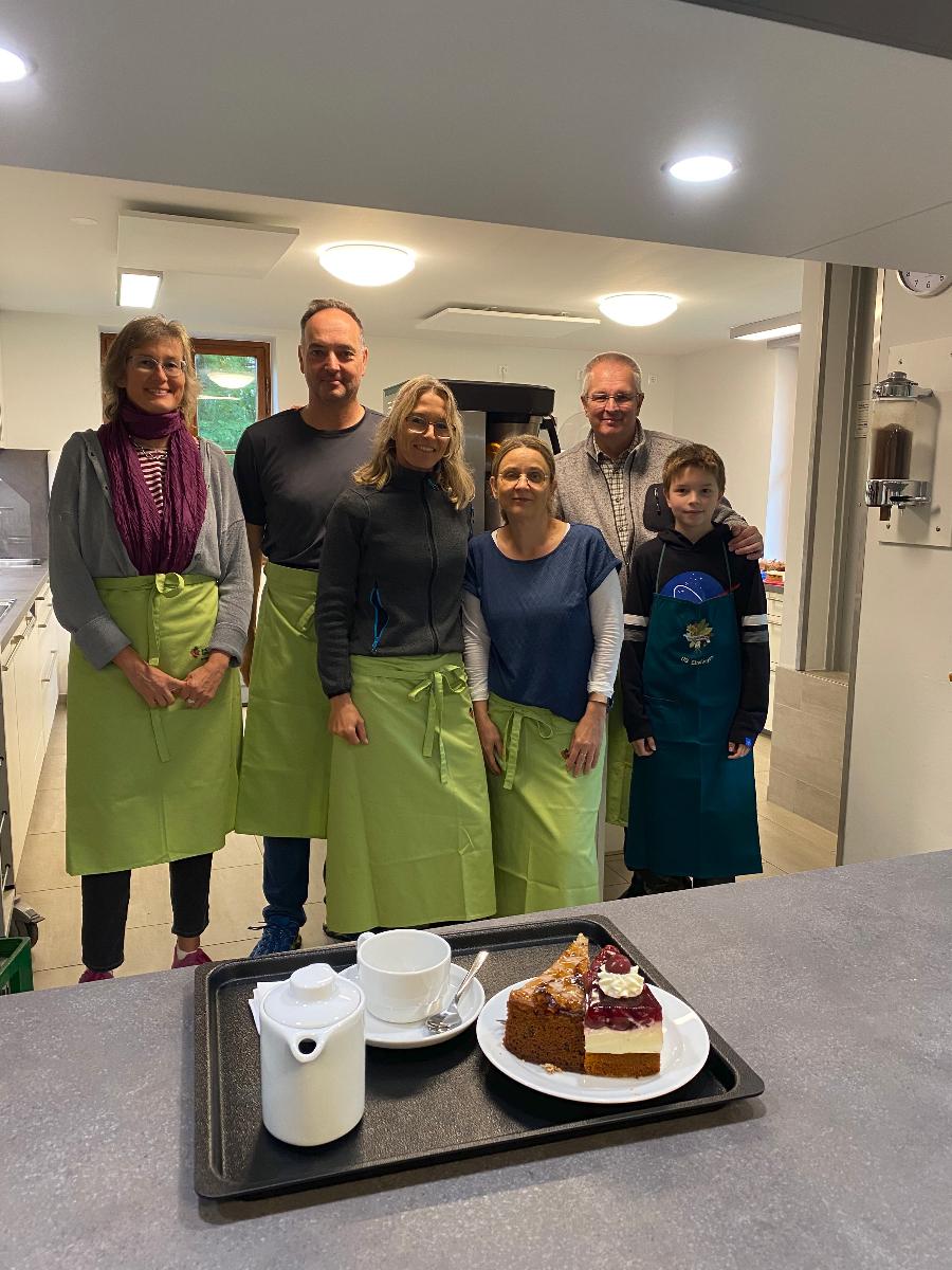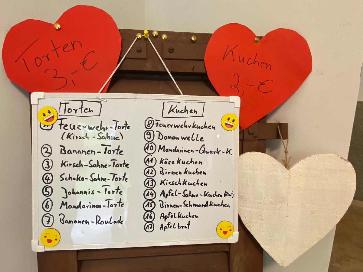 Die Wetterprognose für Sonntag war eigentlich nicht besonders gut – umso positiver überrascht wurden wir dann, denn es blieb trocken bei Temperaturen um 15-20 Grad. Bereits Vormittags konnten wir ca. 20 Gäste bewirten, Nachmittags waren es dann ca. 45 – 50 weitere Gäste, die vorwiegend die wärmenden Sonnenstrahlen im Freien genießen wollten. Was uns sehr gefreut hat war das Lob der Gäste bezüglich der leckeren Kuchen. Da die Gästezahl am gesamten Wochenende unter der erwarteten lag und nicht alle 22 Kuchen und Torten verkauft werden konnten, gab es am Sonntag ab 16.30 Uhr „Happy Hour“, sprich die Kuchen und Torten wurden zum halben Preis angeboten bzw. die Reststücke an die noch vor Ort befindlichen Kuchenbäckerinnen verteilt.