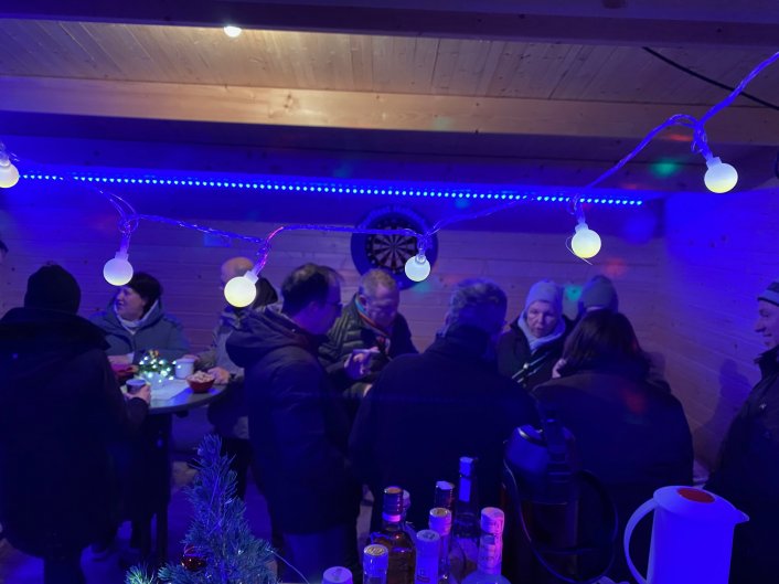 Zum Abschluss der Adventsfensteraktion haben sich am Freitag, 03.01.2025 zwischen 17 und 21 Uhr ca. 35 Mitglieder und Gäste zu einem gemütlichen Umtrunk getroffen. Wir hatten Glück mit dem Wetter! Es war zwar kalt, aber trocken und die Kinder hatten Ihren Spaß an der Feuerschale und beim Stockbrot grillen. Die Erwachsenen machten es sich vorwiegend in der Hütte beim Mini-Christbaum gemütlich und ließen sich Hotdogs, Käsebrote, Würfelschnaps und vermutlich beim ein oder anderen auch der letzte Glühwein und Kinderpunsch für diese Saison, schmecken.